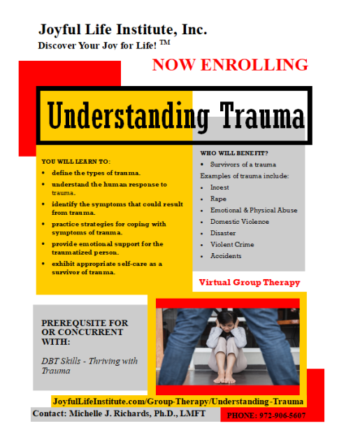 The fifteen-week Women's Trauma Group is designed to create a therapeutic support group for trauma survivors. This group introduces participants to the basics: types of trauma, trauma responses,