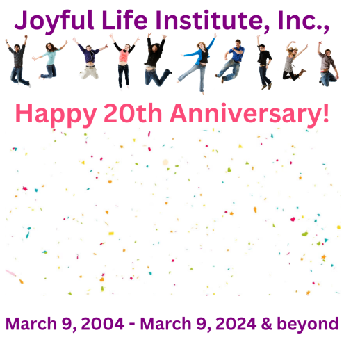 Joyful Life Institute, Inc. will be CLOSED from Tuesday, December 24, 2024, to Tuesday, January 7, 2025, EXCEPT for Monday, December 30, 2024. Clients desiring an appointment during this period may schedule one on Monday, December 30, 2024. Regularly scheduled appointments resume on Tuesday, January 7, 2025.
